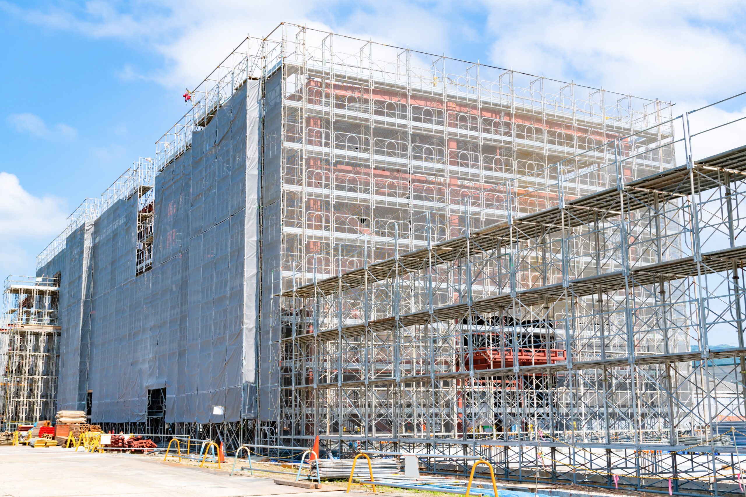 とび工事は、建設現場での足場設置や鉄骨の組立など、高所作業を伴う仮設・組立工事です。